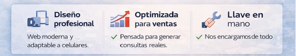 Todas las promos incluyen registro de domino .com, alojamiento web por 12 meses, 3 emails corporativos, certificado ssl web segura, indexación a google, optimizacion de fotos, textos, diseño profesional, llave en mano! es un pago unico sin gastos mensuales sin gastos adicionales. 50% al comenzar y el resto al concluir el diseño.